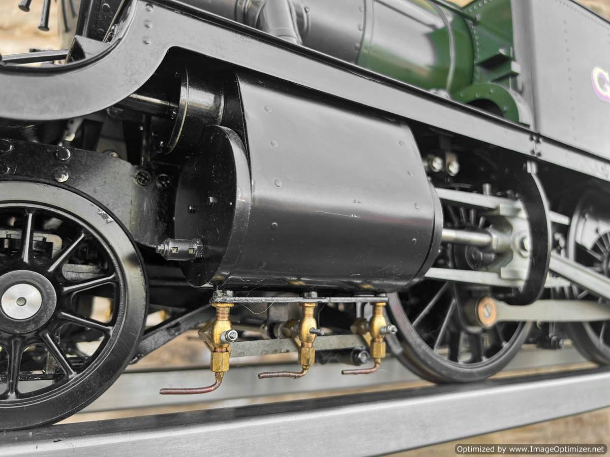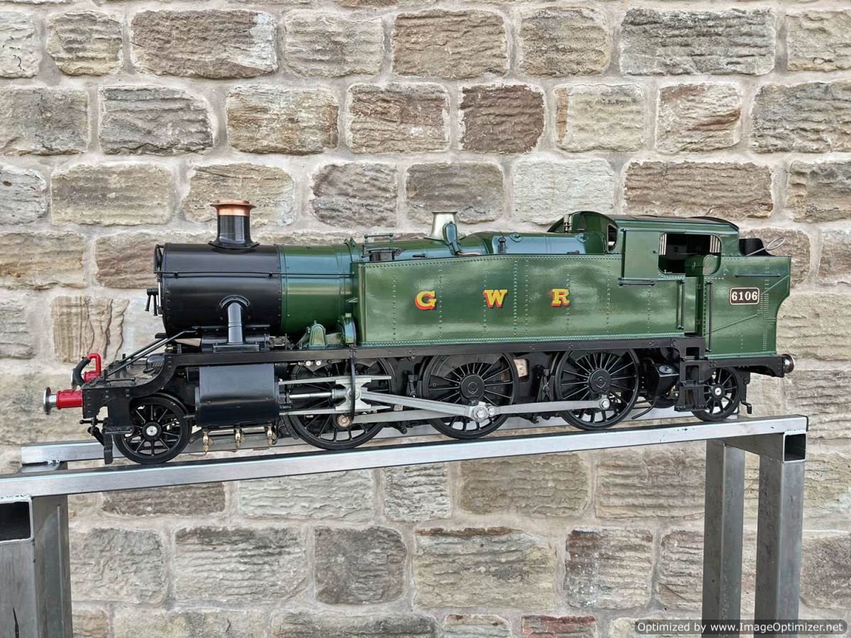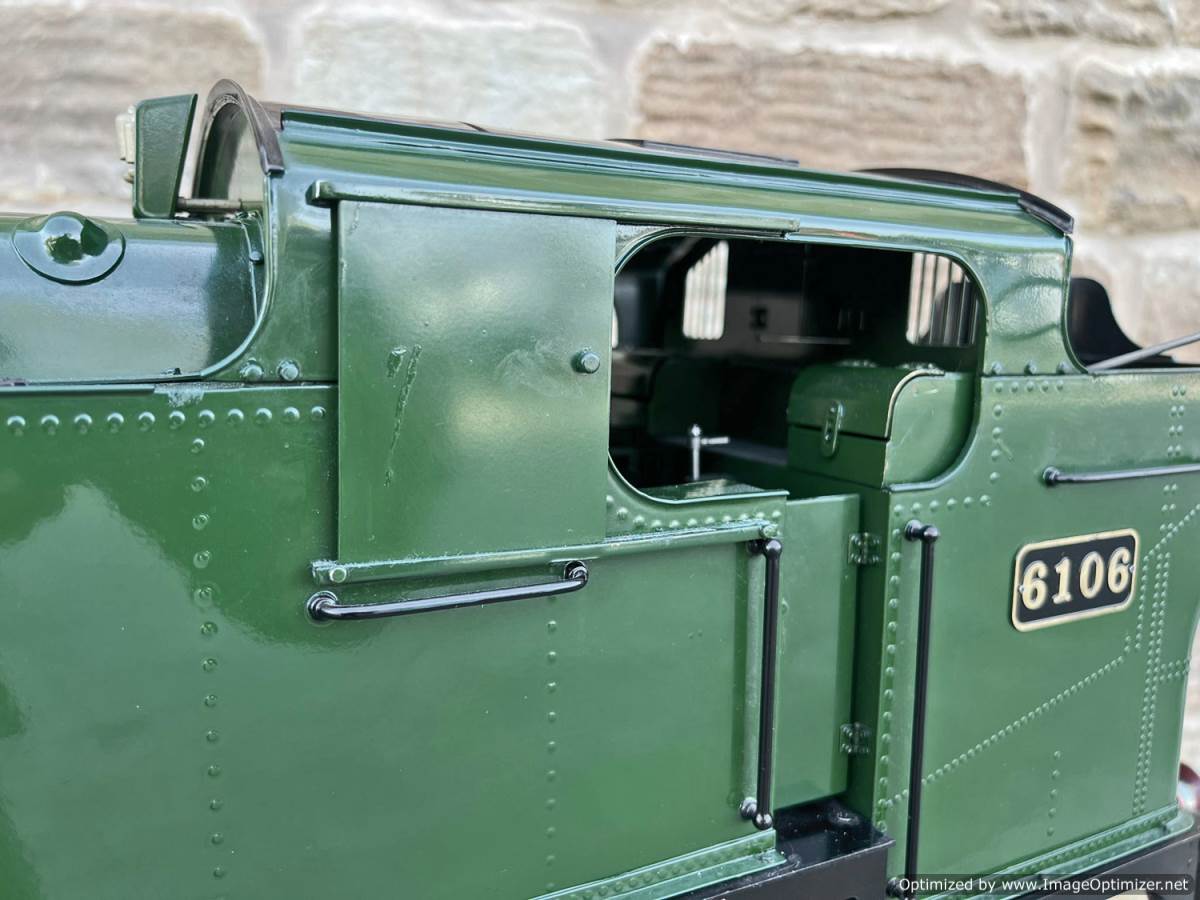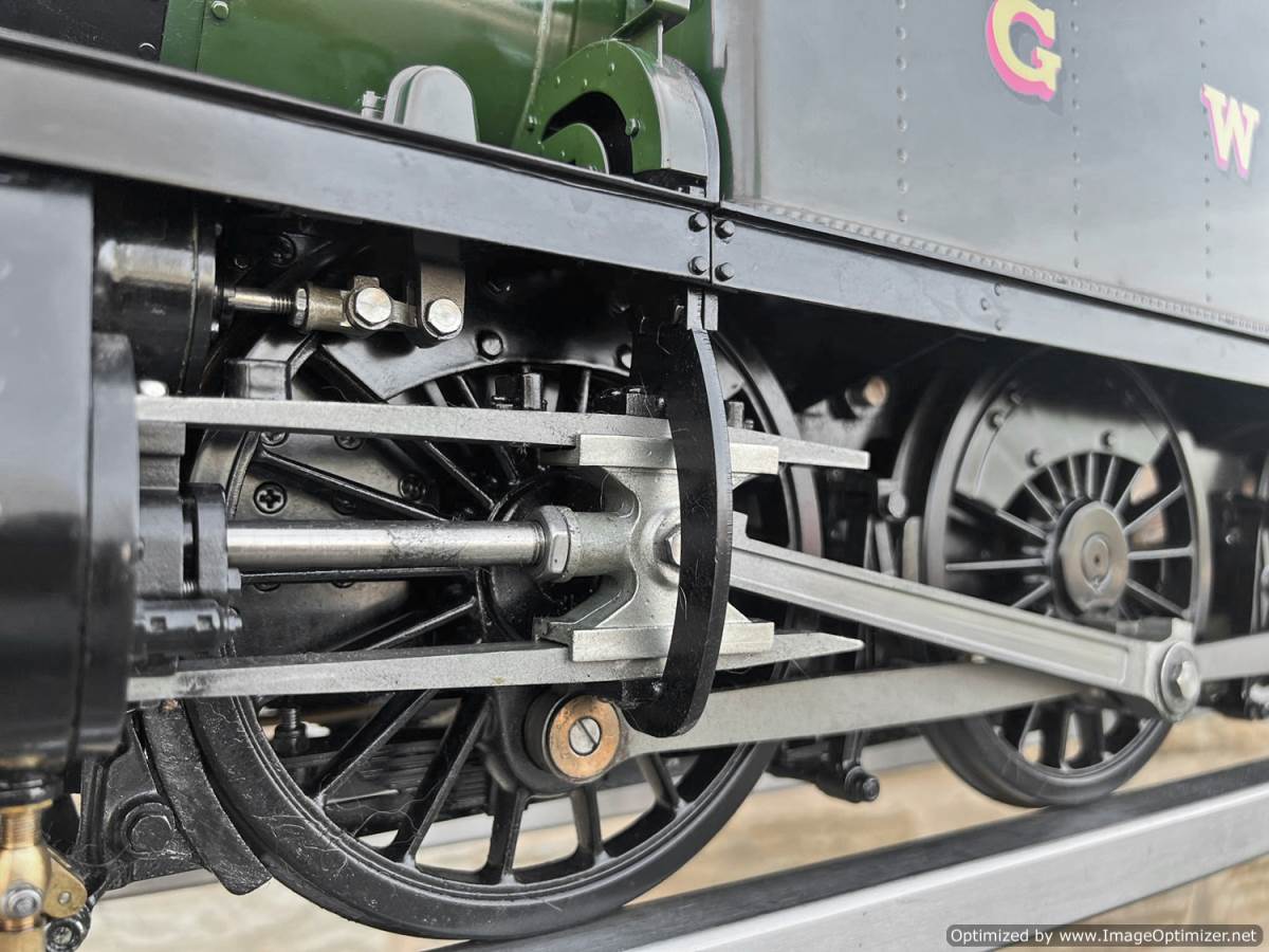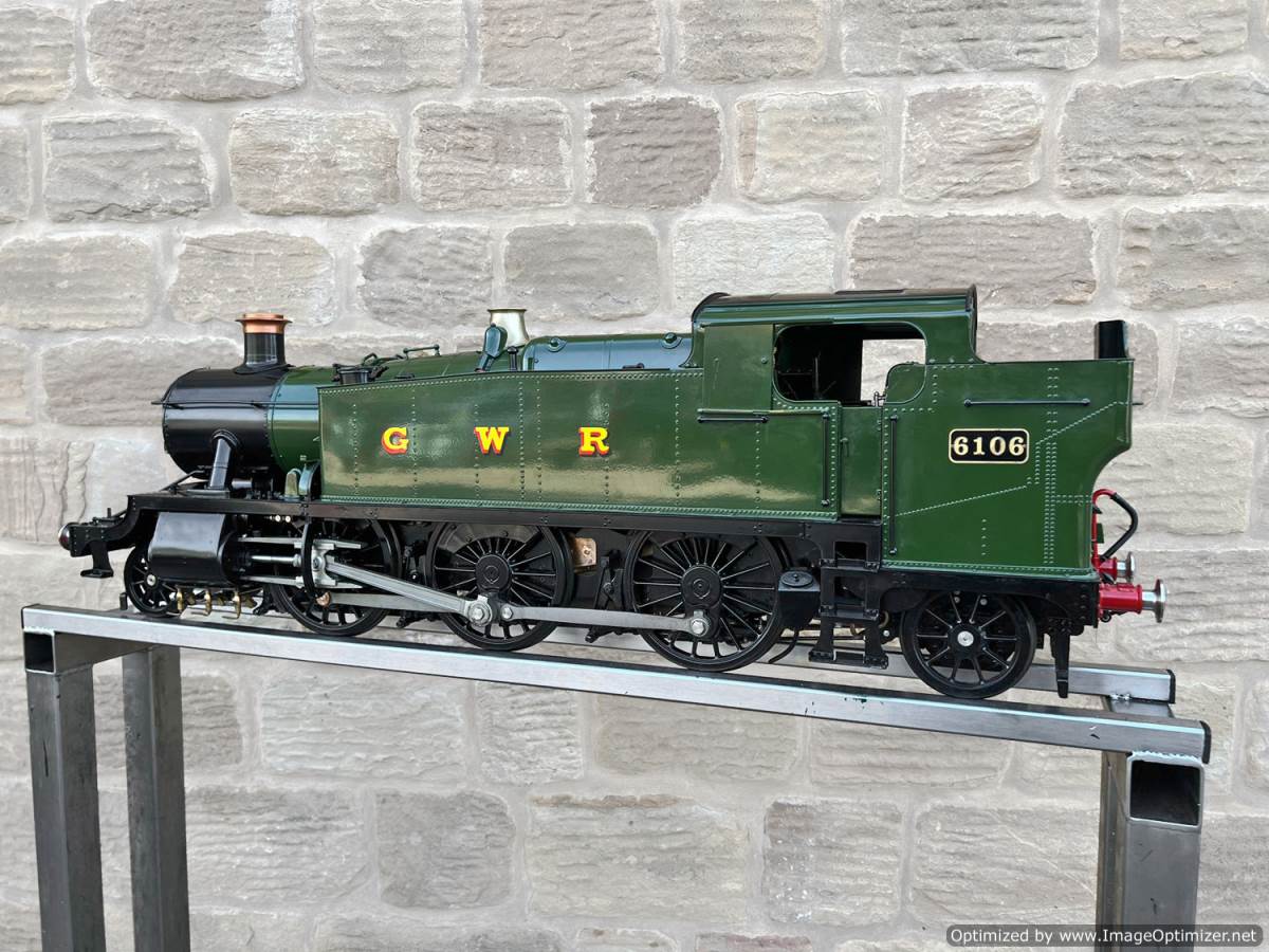 Here we have a 5" gauge GWR 61xx Large Prairie from Kingscale. Only steamed on a couple of occasions, essentially it's a brand new model. The level of detail on this latest offering from Kingscale is just superb. The sanding gear, the folding driver seats and opening footplate doors,..... it's a really beautiful looking model, and if it were a model engineer built large Prarie to the Trevor Shortland design with this level of detail it could easily be over twice this price. We think this one is actually Kingscale's Pilot model, because delivery of the production run from the manufacturer has only just started, and as such It's still got the usual manufacturing tolerance issues on the valve gear and bottom end generally, and so everything is a bit loose and sloppy down there. That said. it looks like it runs freely enough, and everything will essentially work. We're confident that if you want to pull yourself round the club track a few sunny Sundays in the year it'll do the job beautifully, but ultimately it's not robust enough to be put into intensive passenger hauling service without a good bit of attention to tighten up some of the slop in the rods and boxes.
