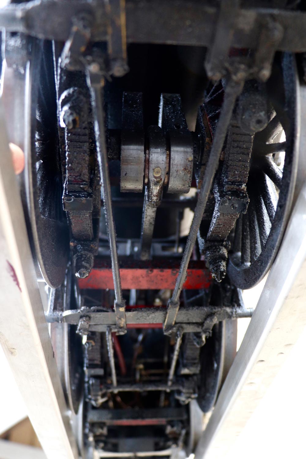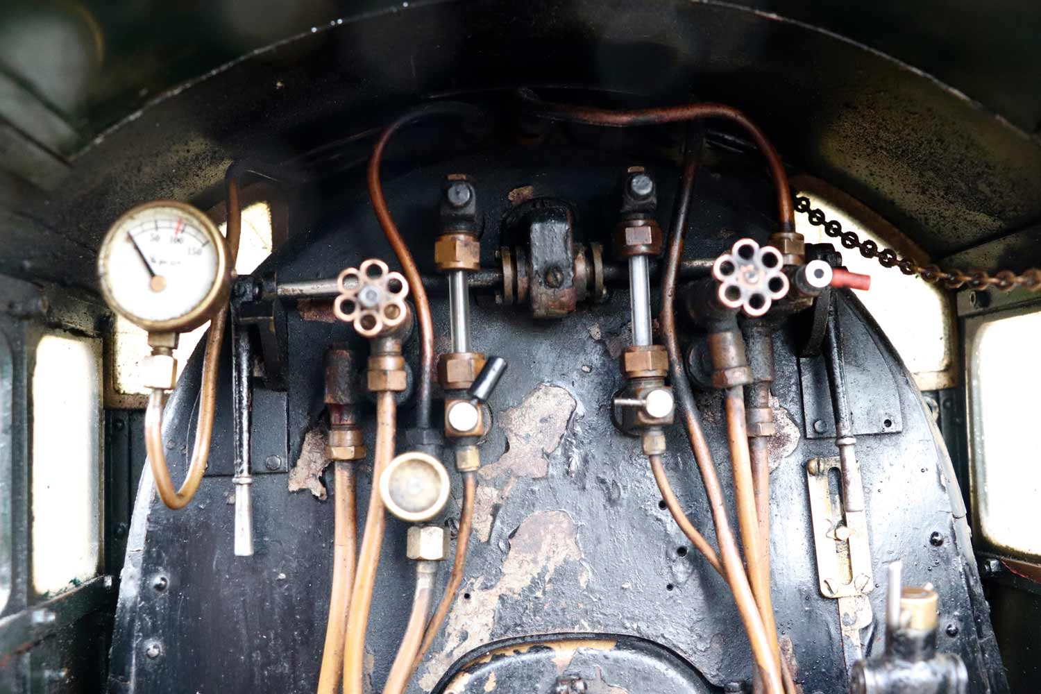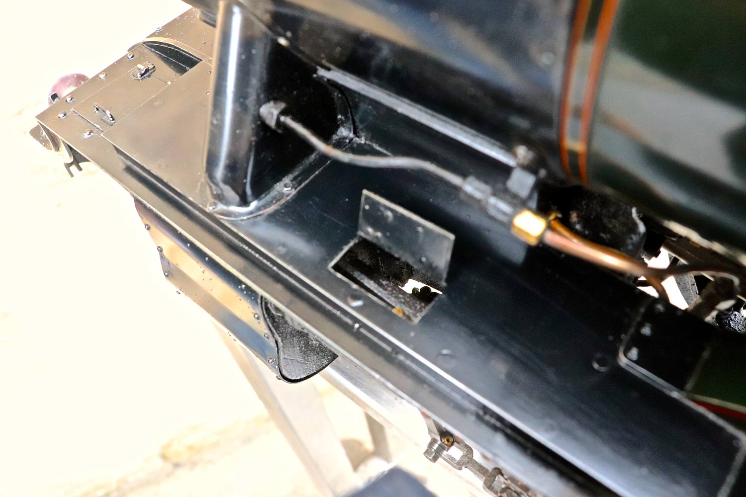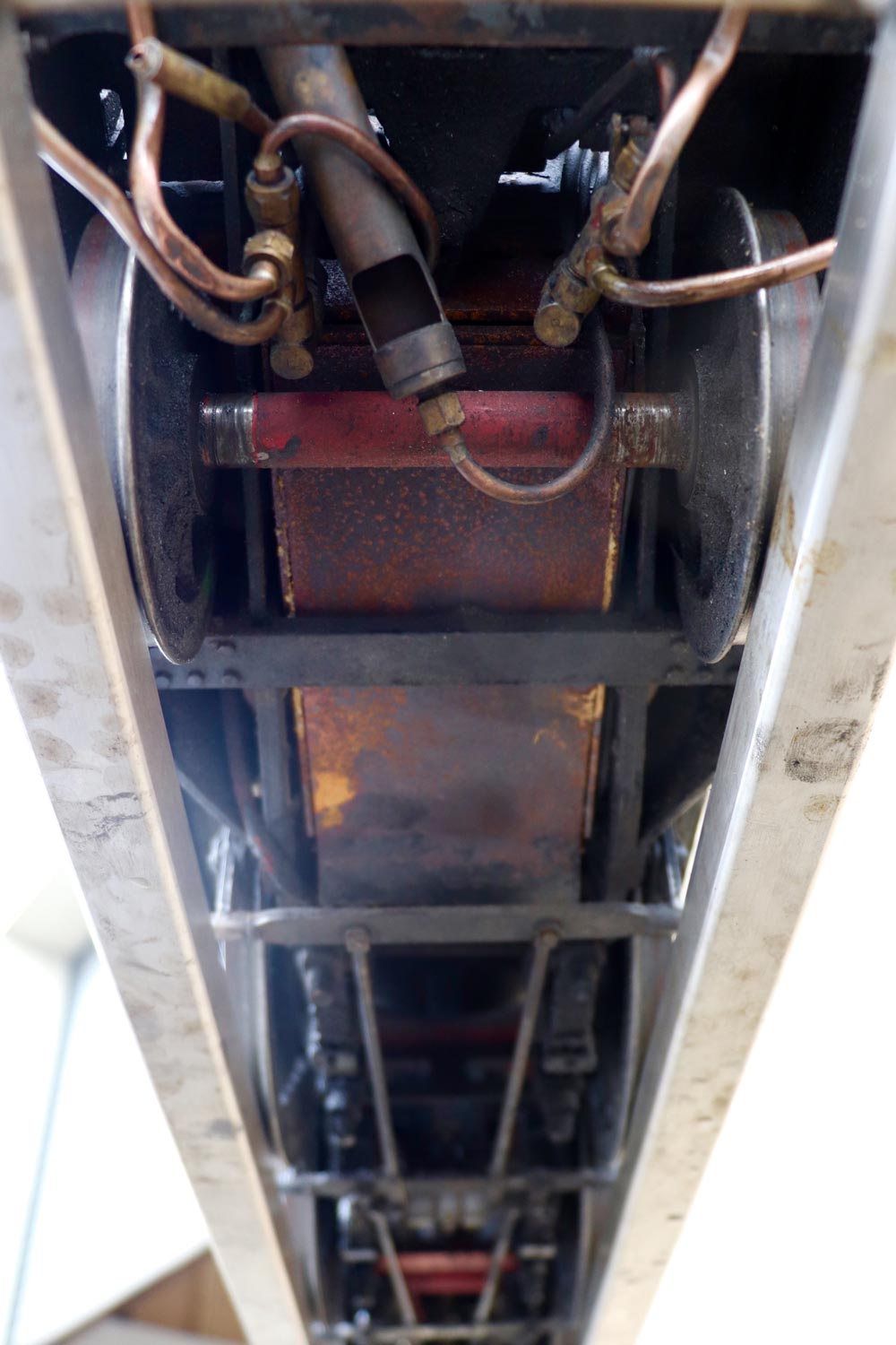 Mechanically as you've no doubt just read, she will be refreshed and ready to go, and the machining work done by the builder is lovely, crisp and neat.  The running boards have little trap doors in them for oiling the motion from the top, and they drop closed with that reassuring 'pop' that you only get with a model where the builder knew how to make things properly!  The boiler is of course copper and silver soldered, comes with a large wedge of old certificates back to the original date of construction which was 1990.  She can of course come with fresh certificates and will be tested and ready to hit the rails.