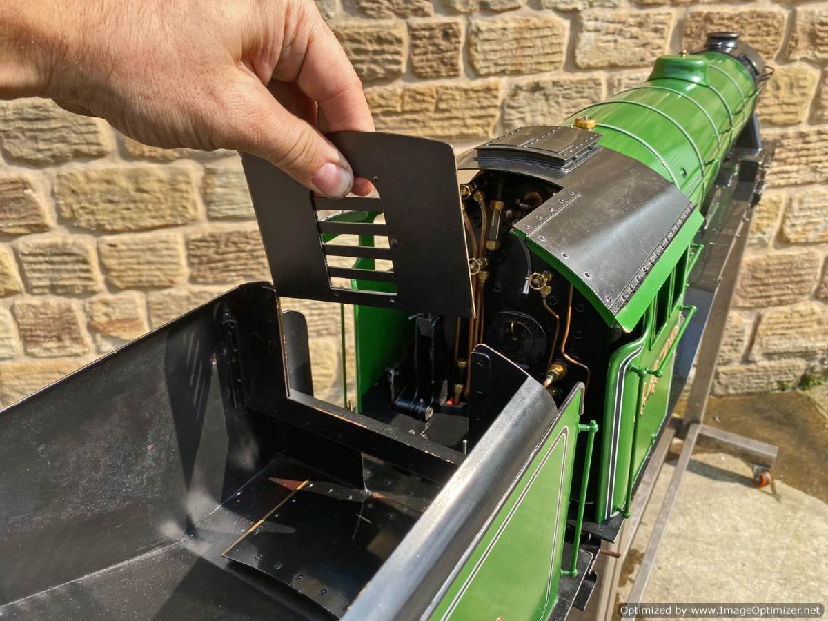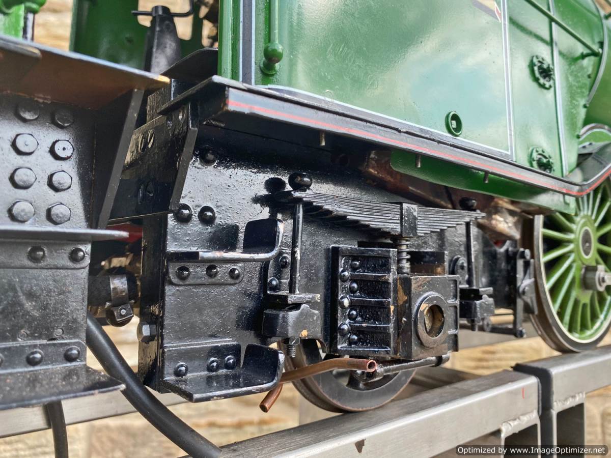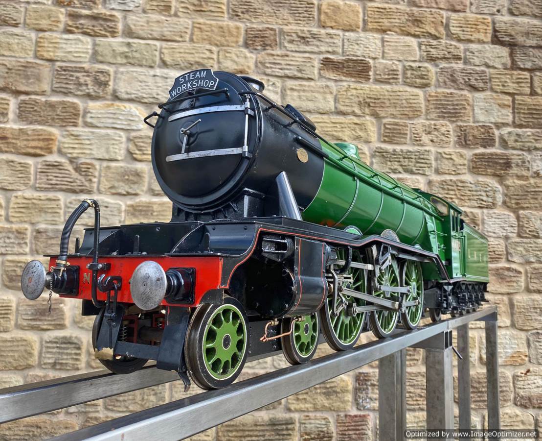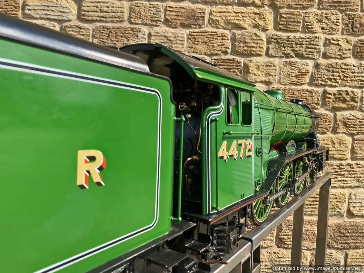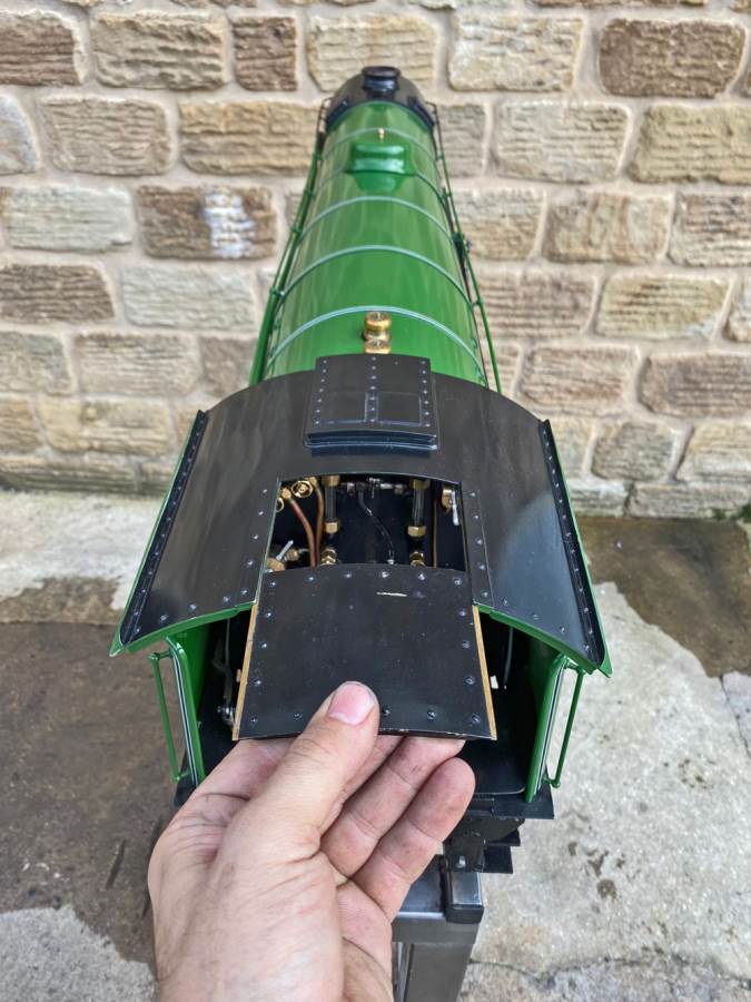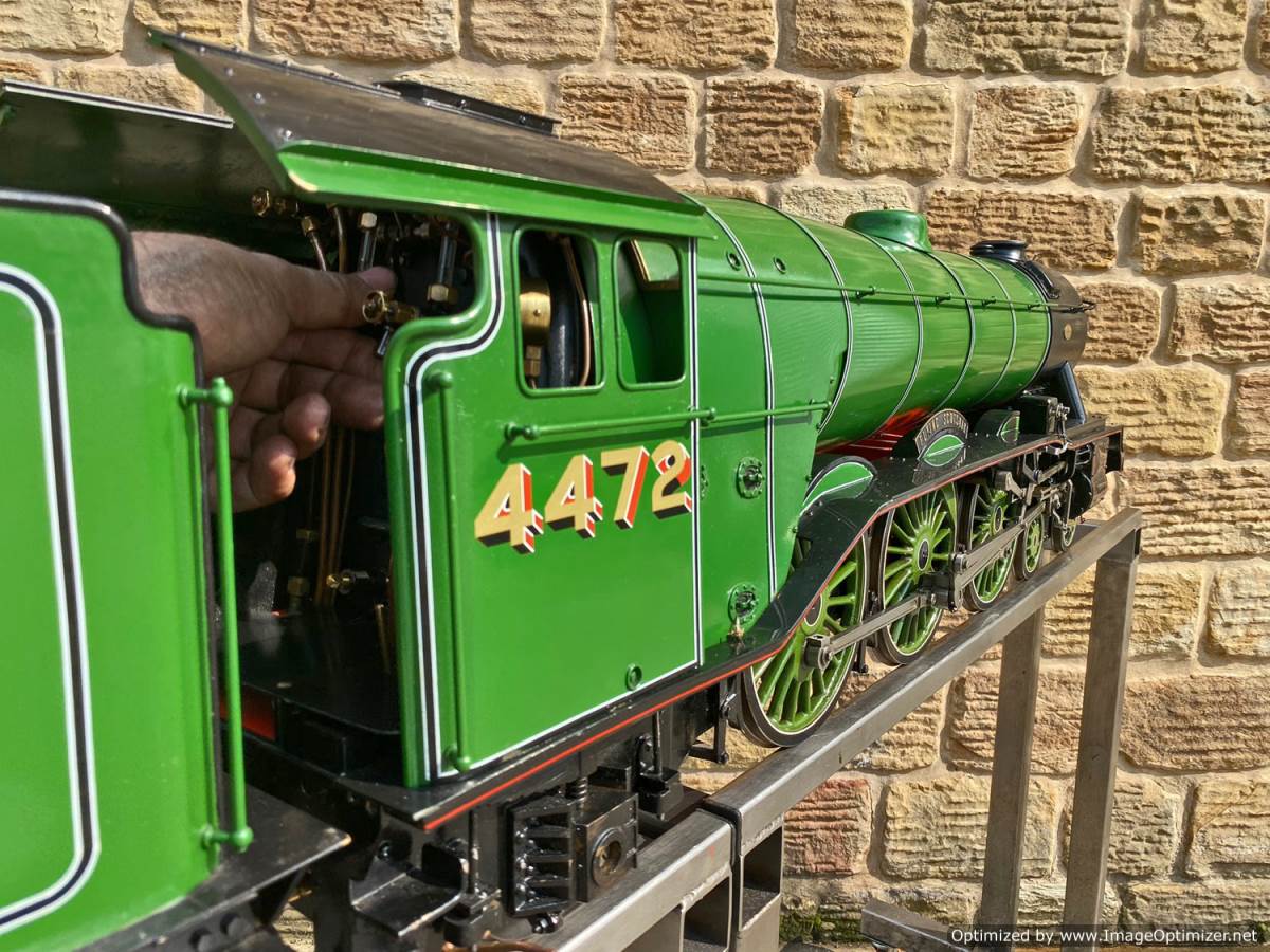 Here we have a pretty much brand new LNER Gresley A3, 4472 Flying Scotsman. Only test steamed on a couple of occasions to make sure everything is working as it should! Technically the model is slightly a halfway house between the original Gresley A1 and the later A3, the cab being the earlier one, the dome not being the banjo and various other detailing differences, but the model is neatly made and sports essentially a brand new professionally made silver soldered copper boiler. We lit the first fire in the model and did the initial tweaks and commissioning, and were pleasantly surprised that there's not too much needing to be done here in the works before she was ready to go.