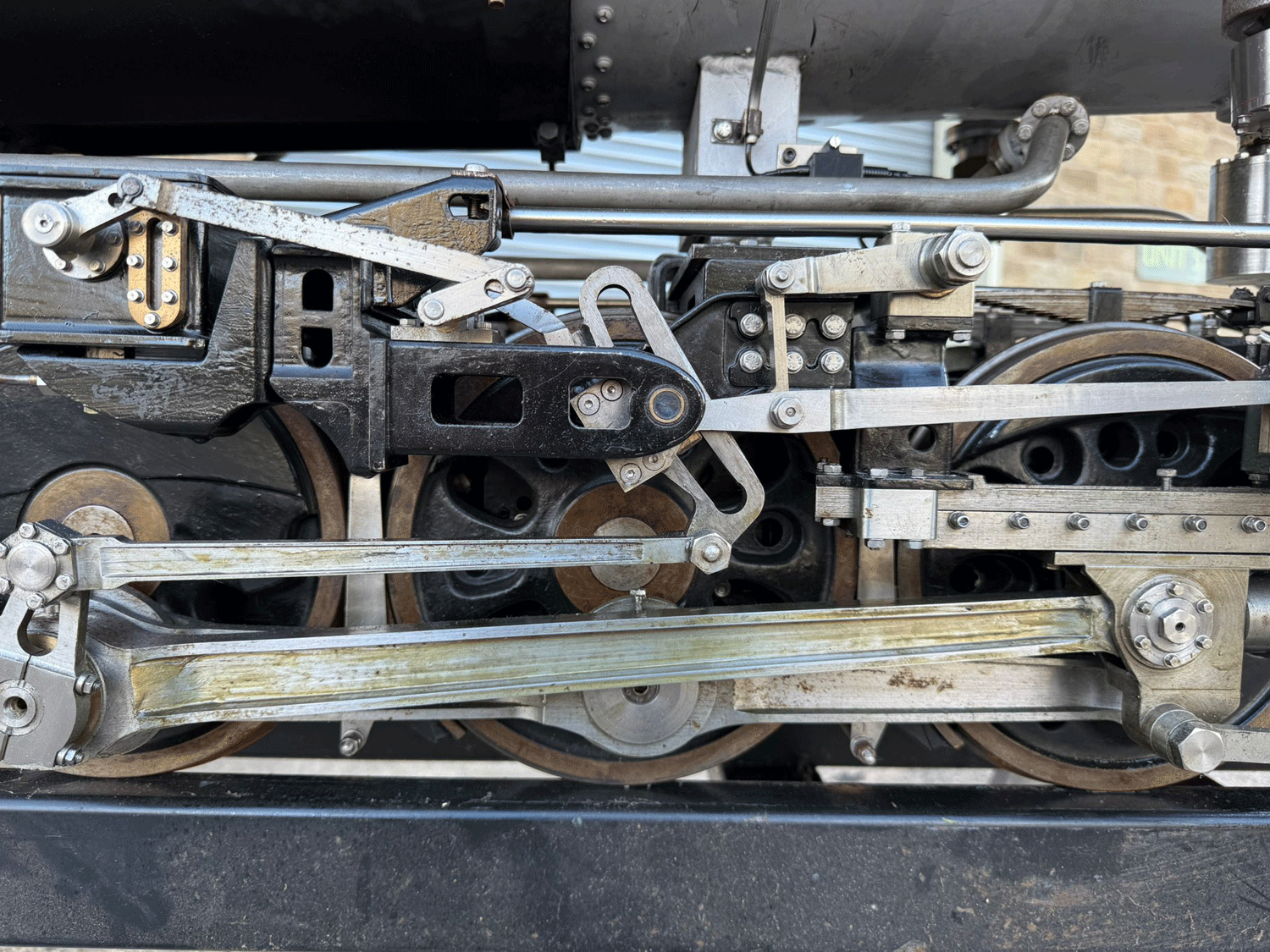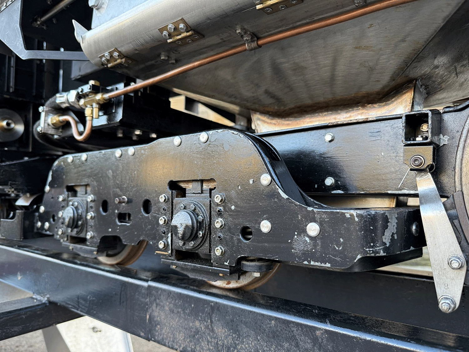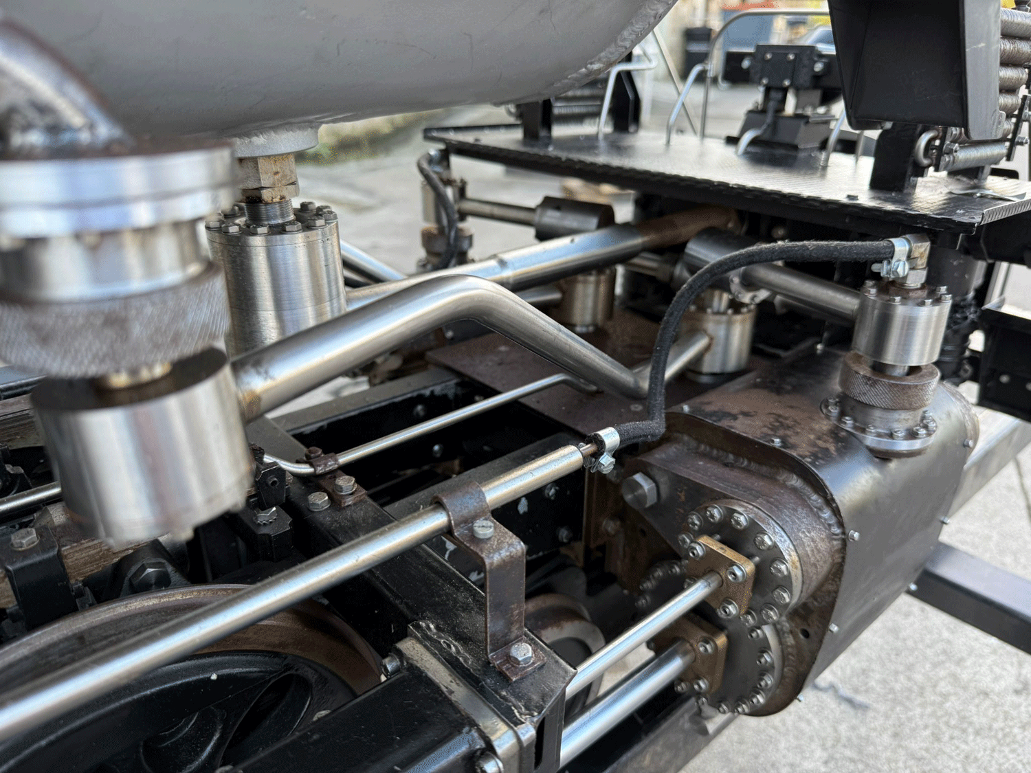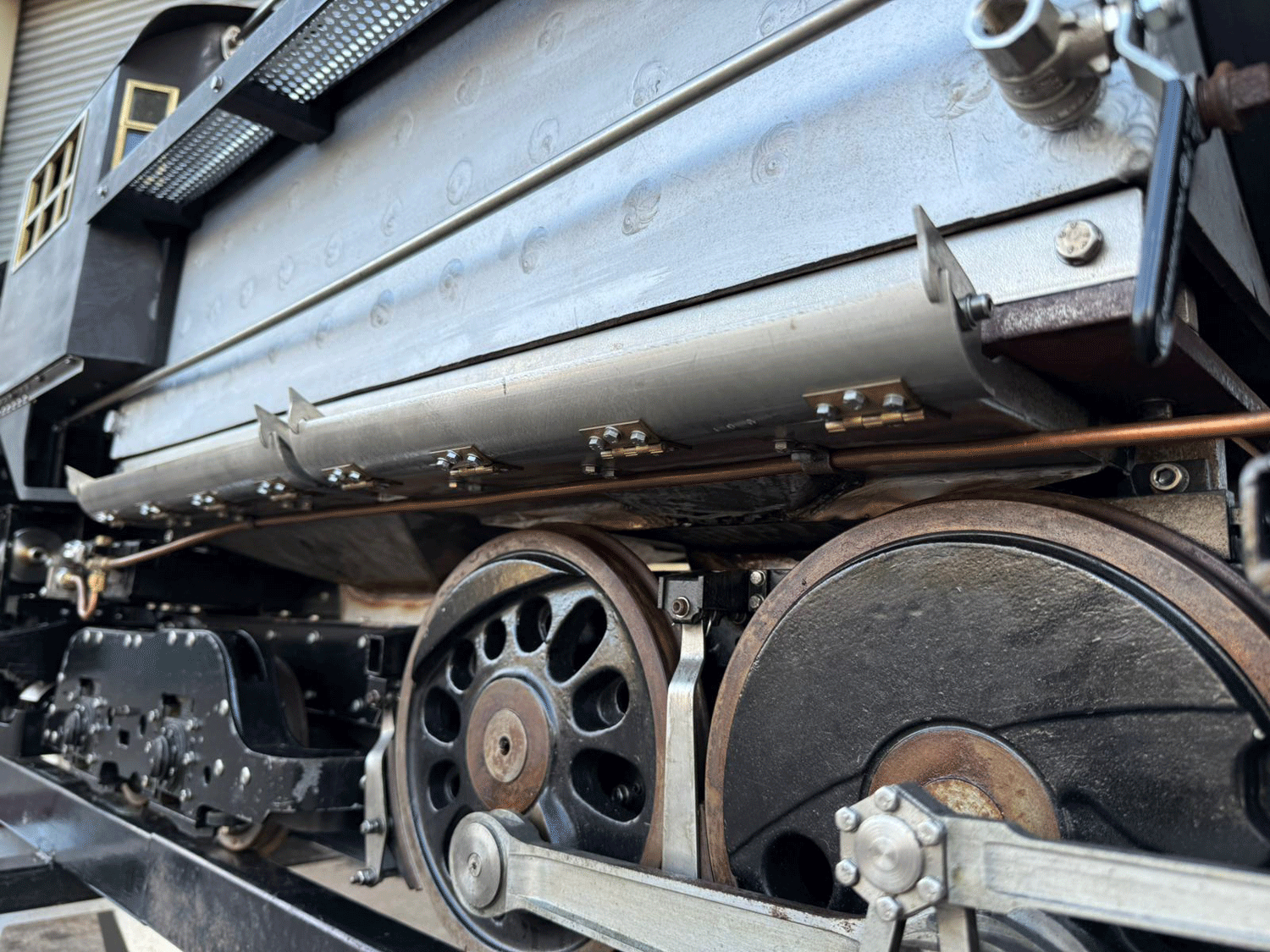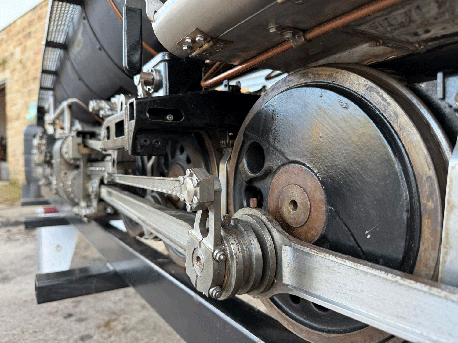 The correctly shaped boiler is steel with expanded in steel tubes, and is professionally (and nicely) made with all the important certification and paperwork. The bottom end is all there, and has run on air, and has also been tested around the track to make sure everything rolls, bends and follows the track as it should!
