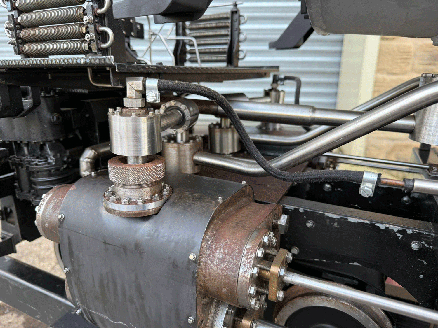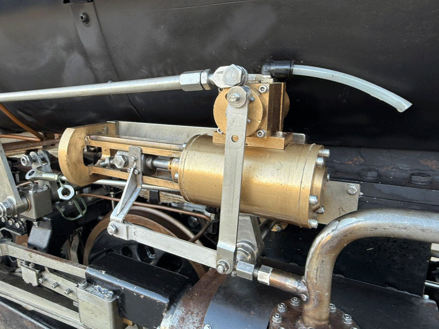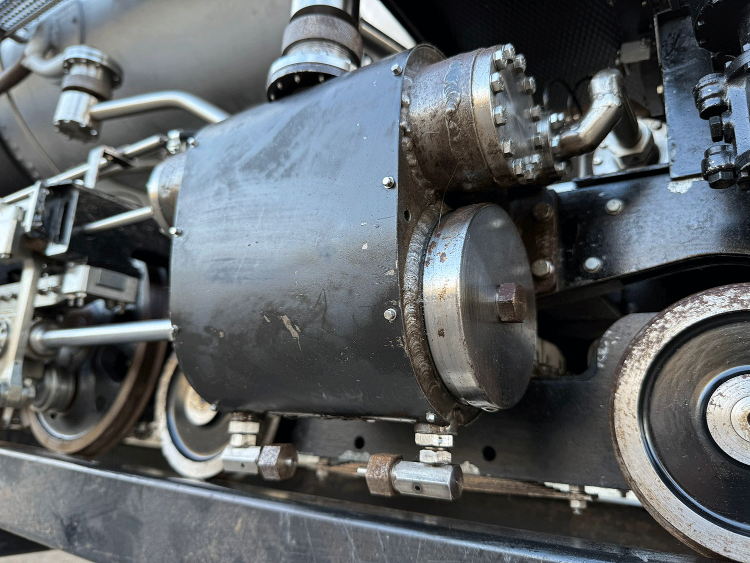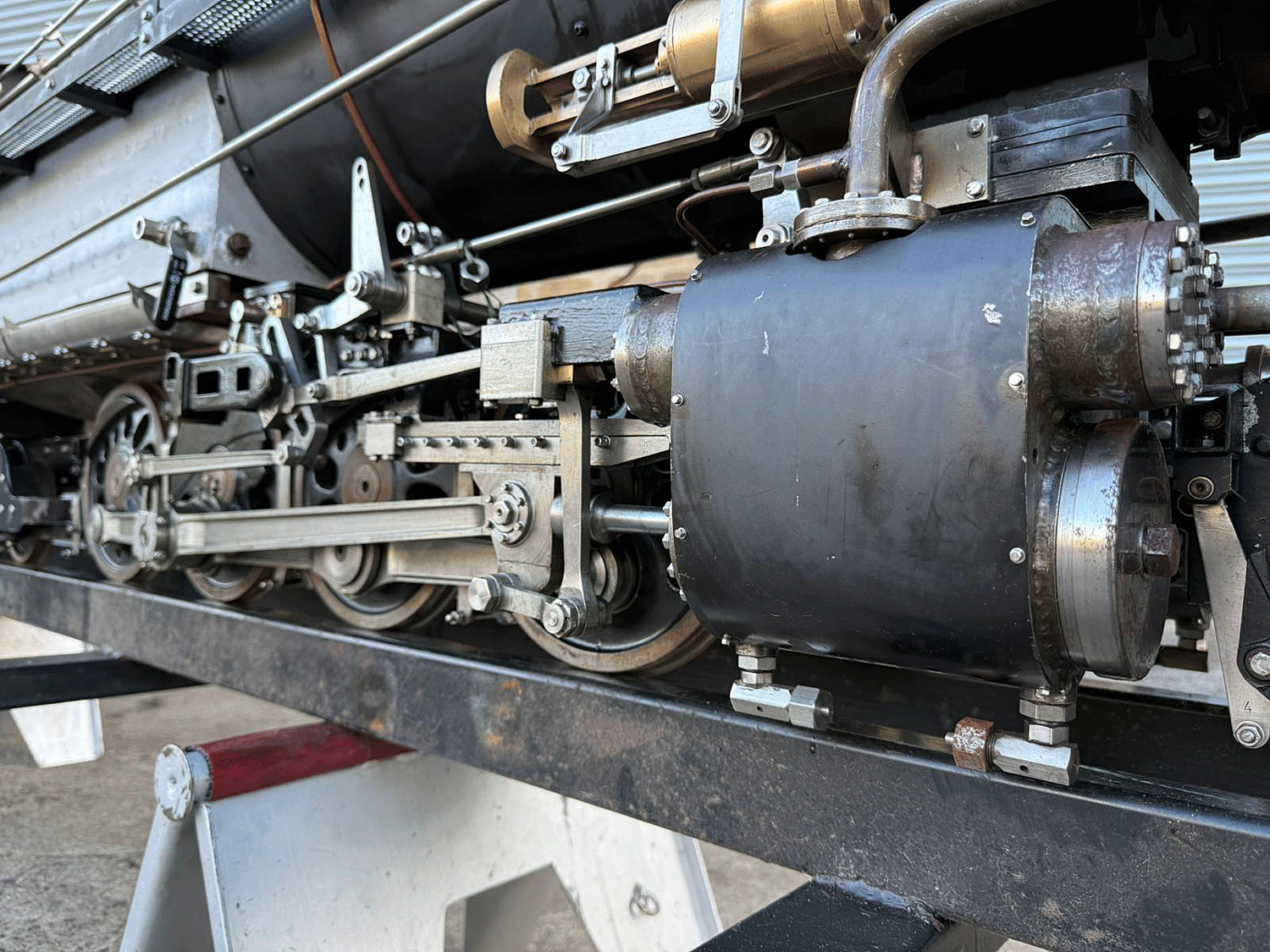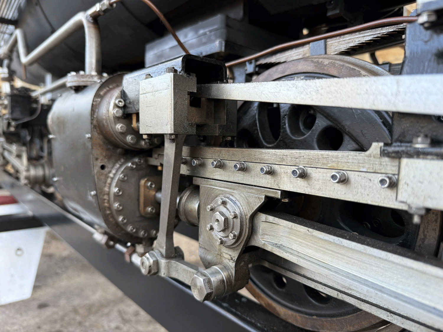 The correctly shaped boiler is steel with expanded in steel tubes, and is professionally (and nicely) made with all the important certification and paperwork. The bottom end is all there, and has run on air, and has also been tested around the track to make sure everything rolls, bends and follows the track as it should!