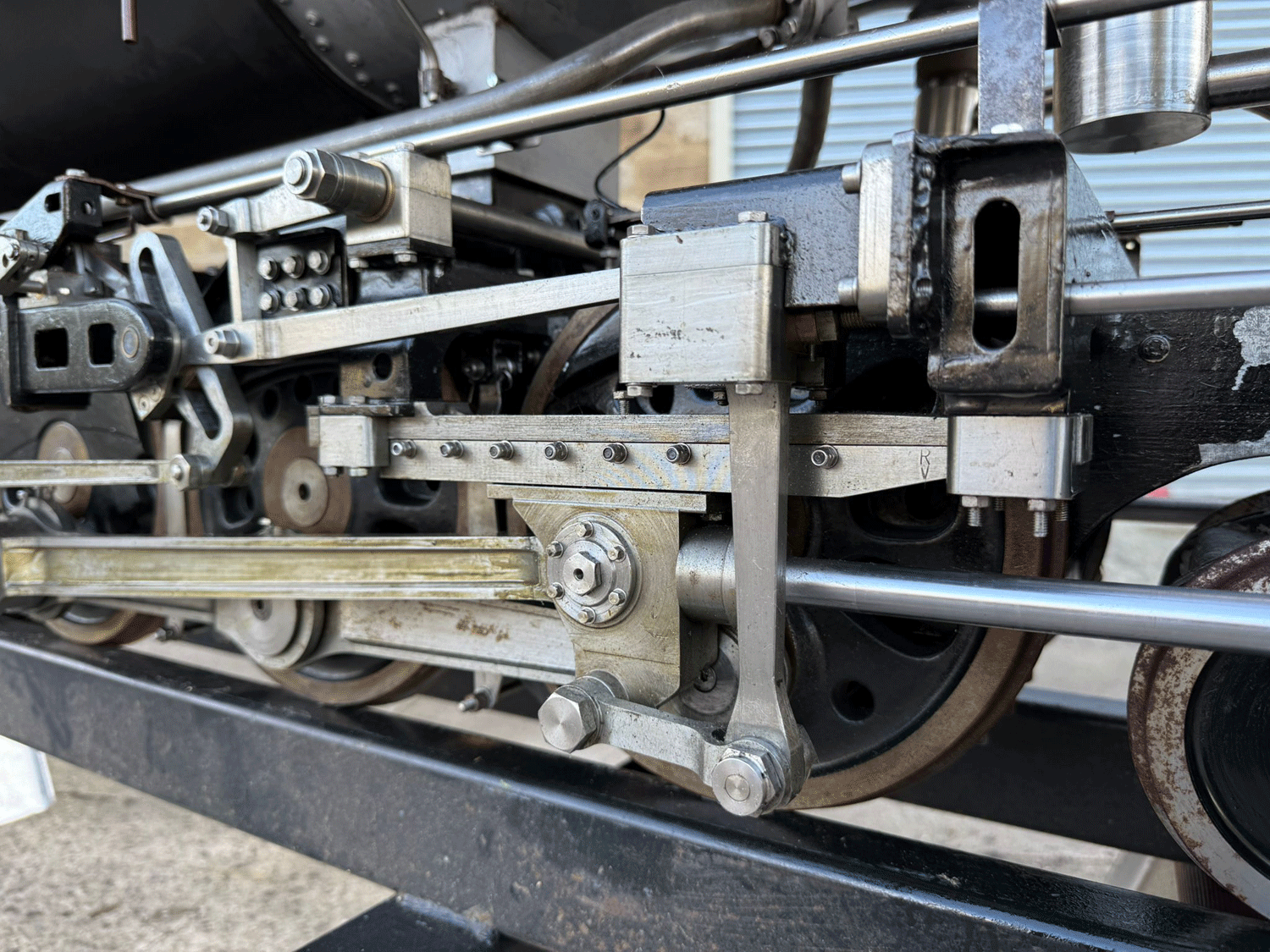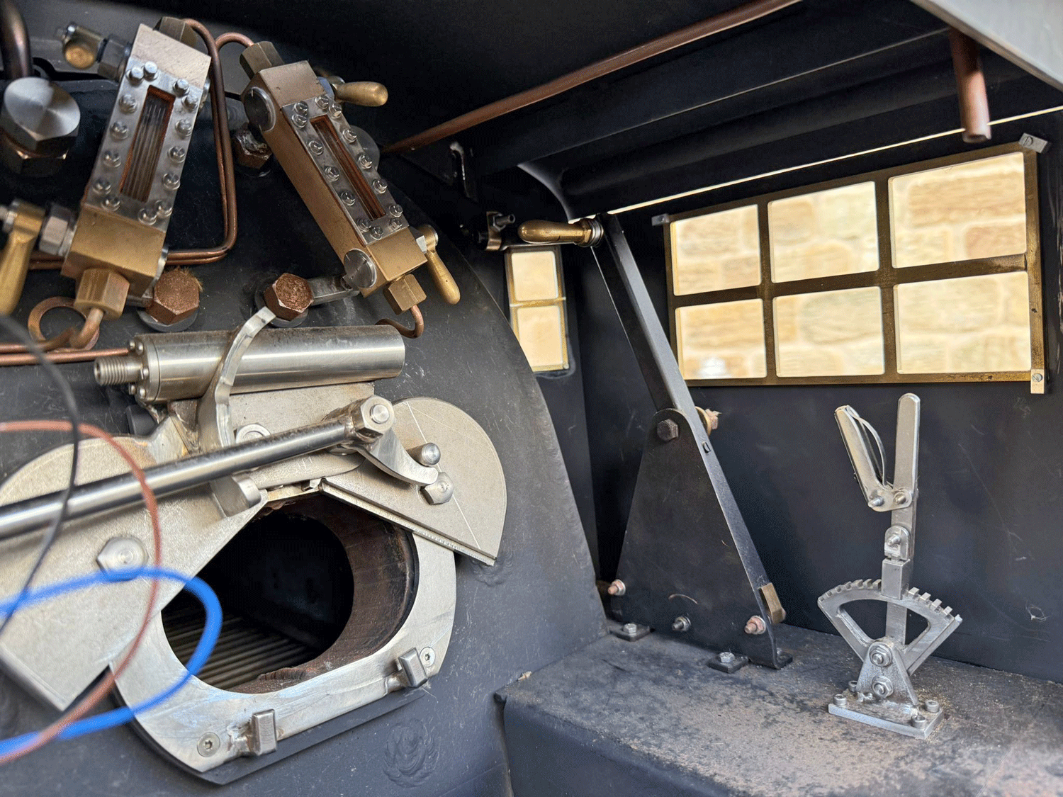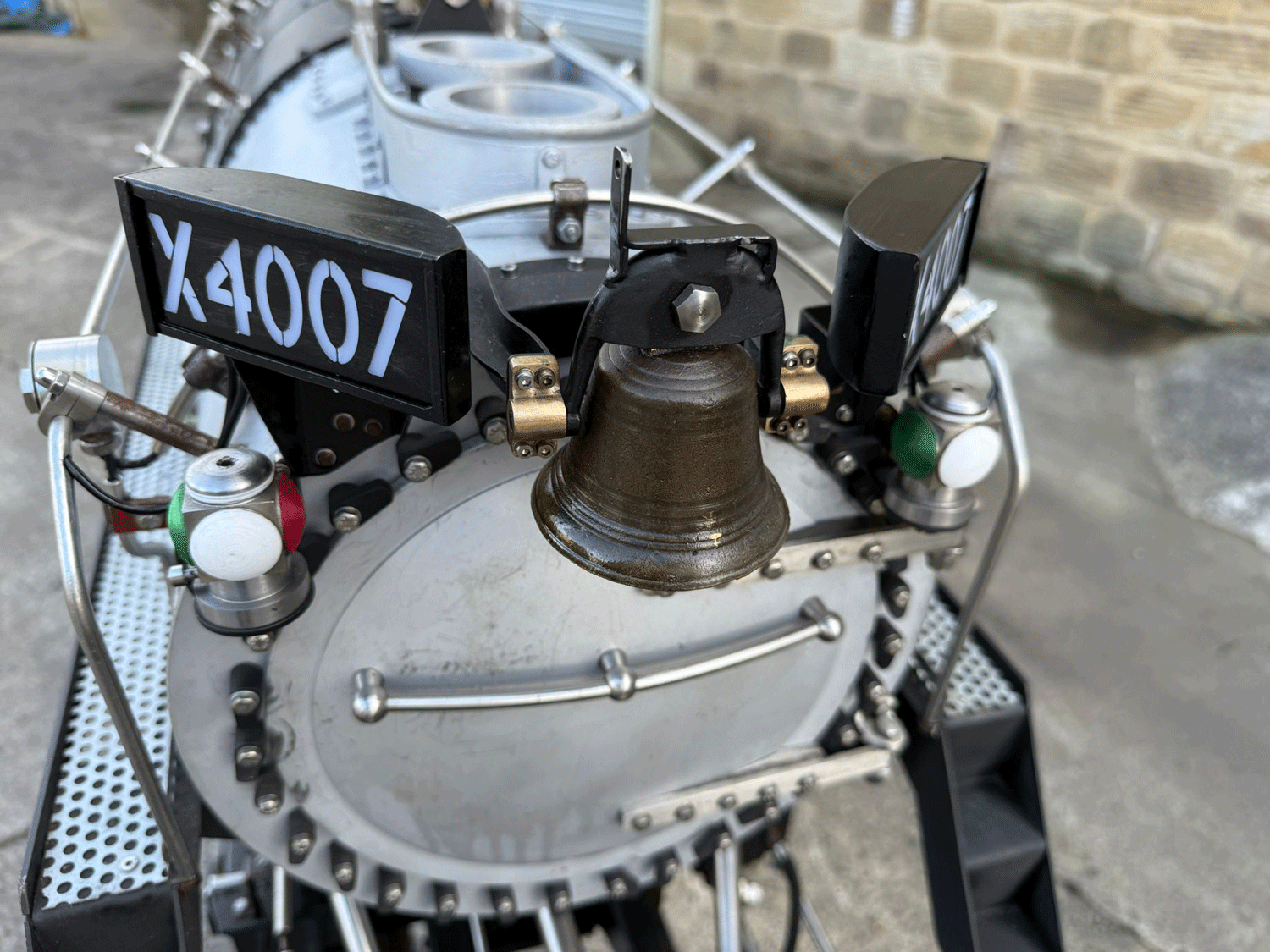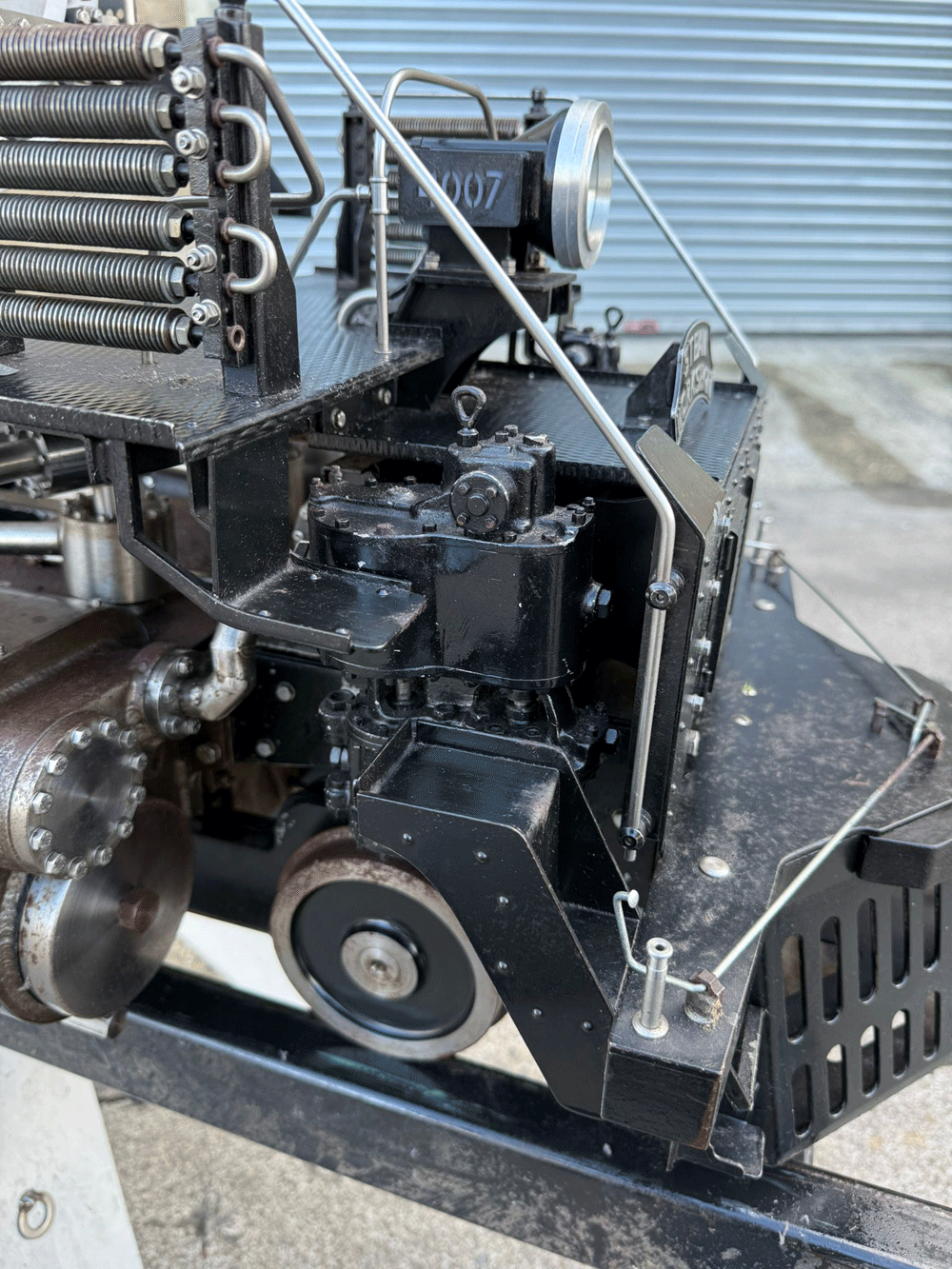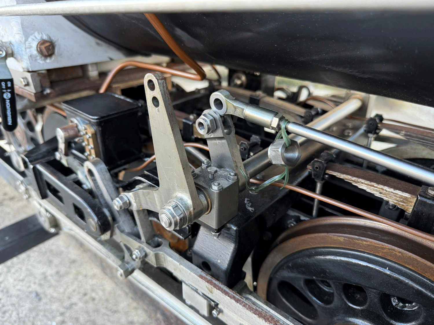 The correctly shaped boiler is steel with expanded in steel tubes, and is professionally (and nicely) made with all the important certification and paperwork. The bottom end is all there, and has run on air, and has also been tested around the track to make sure everything rolls, bends and follows the track as it should!