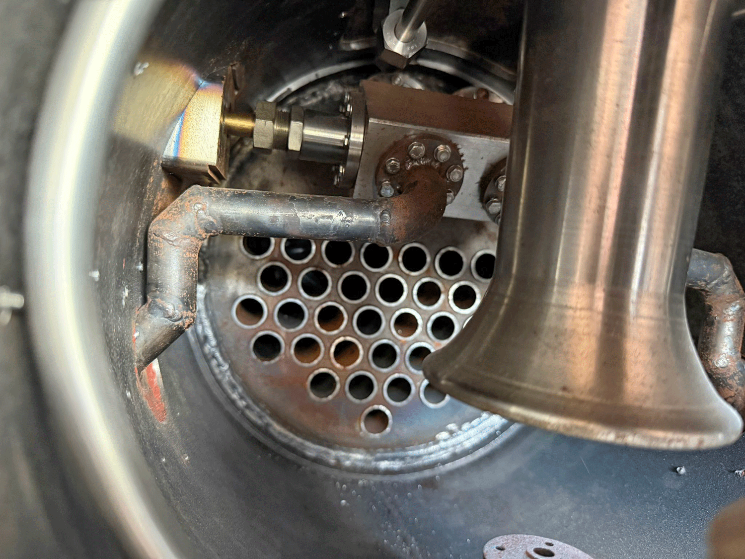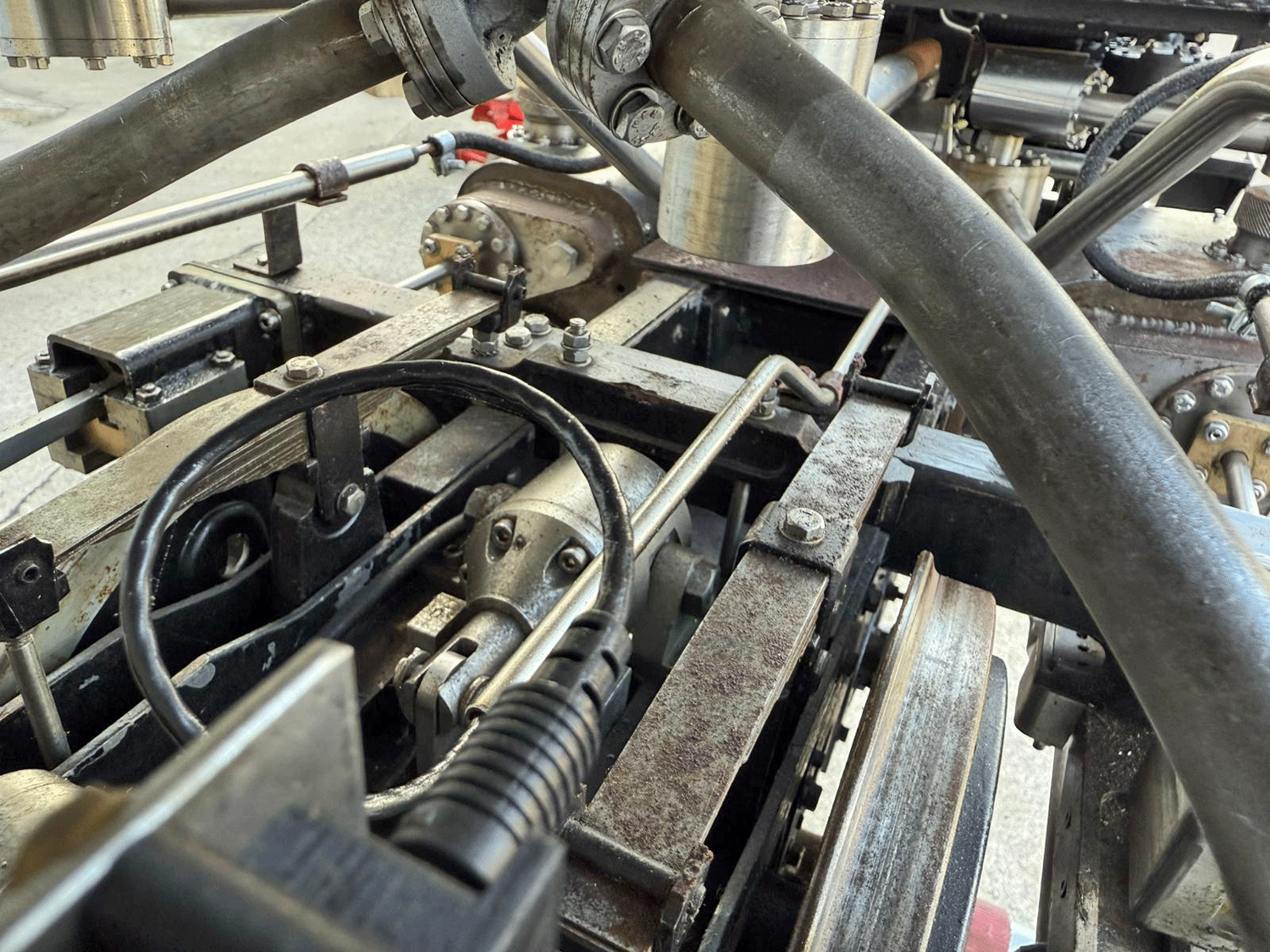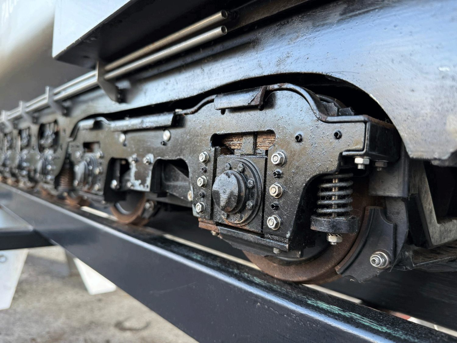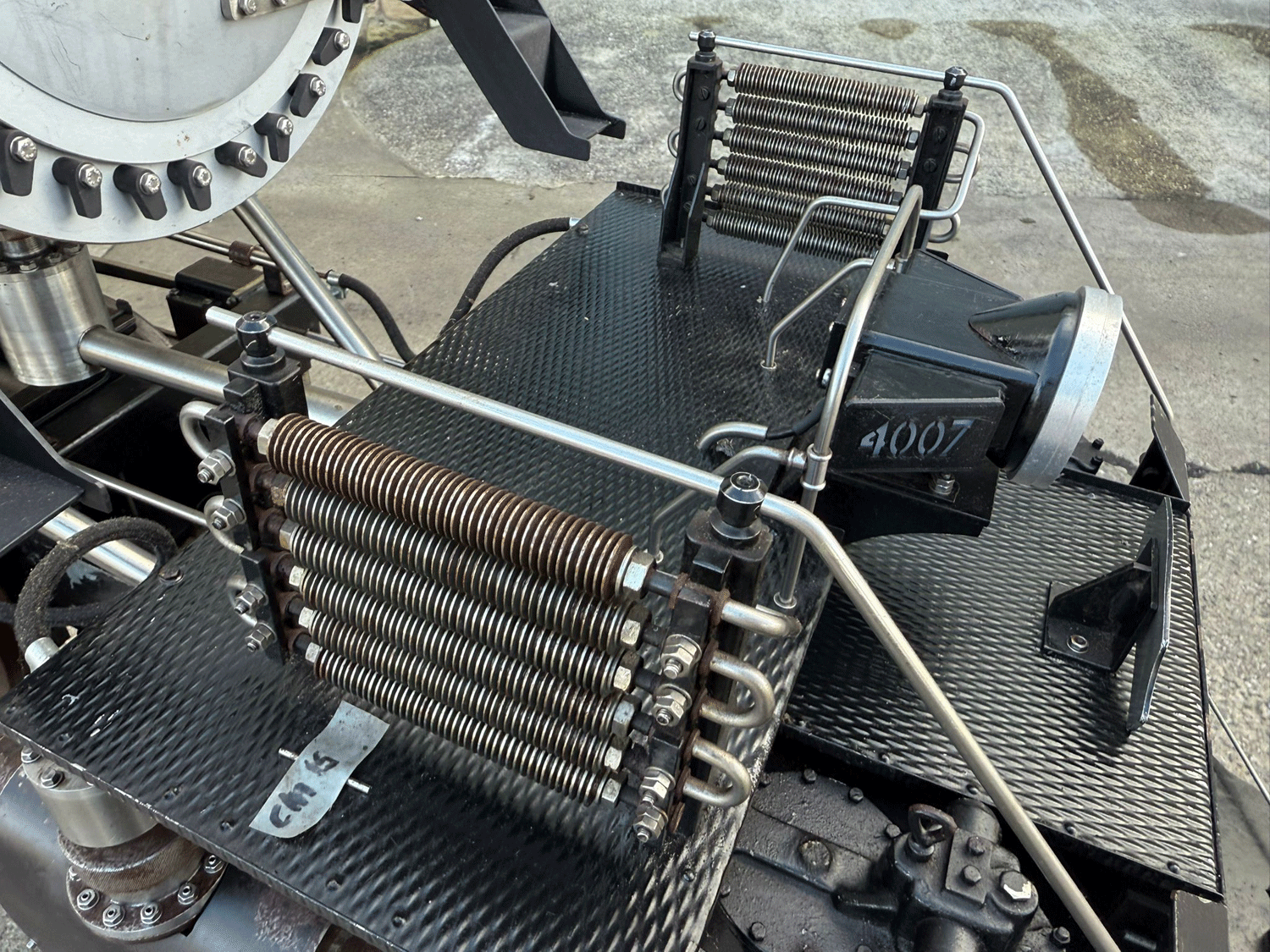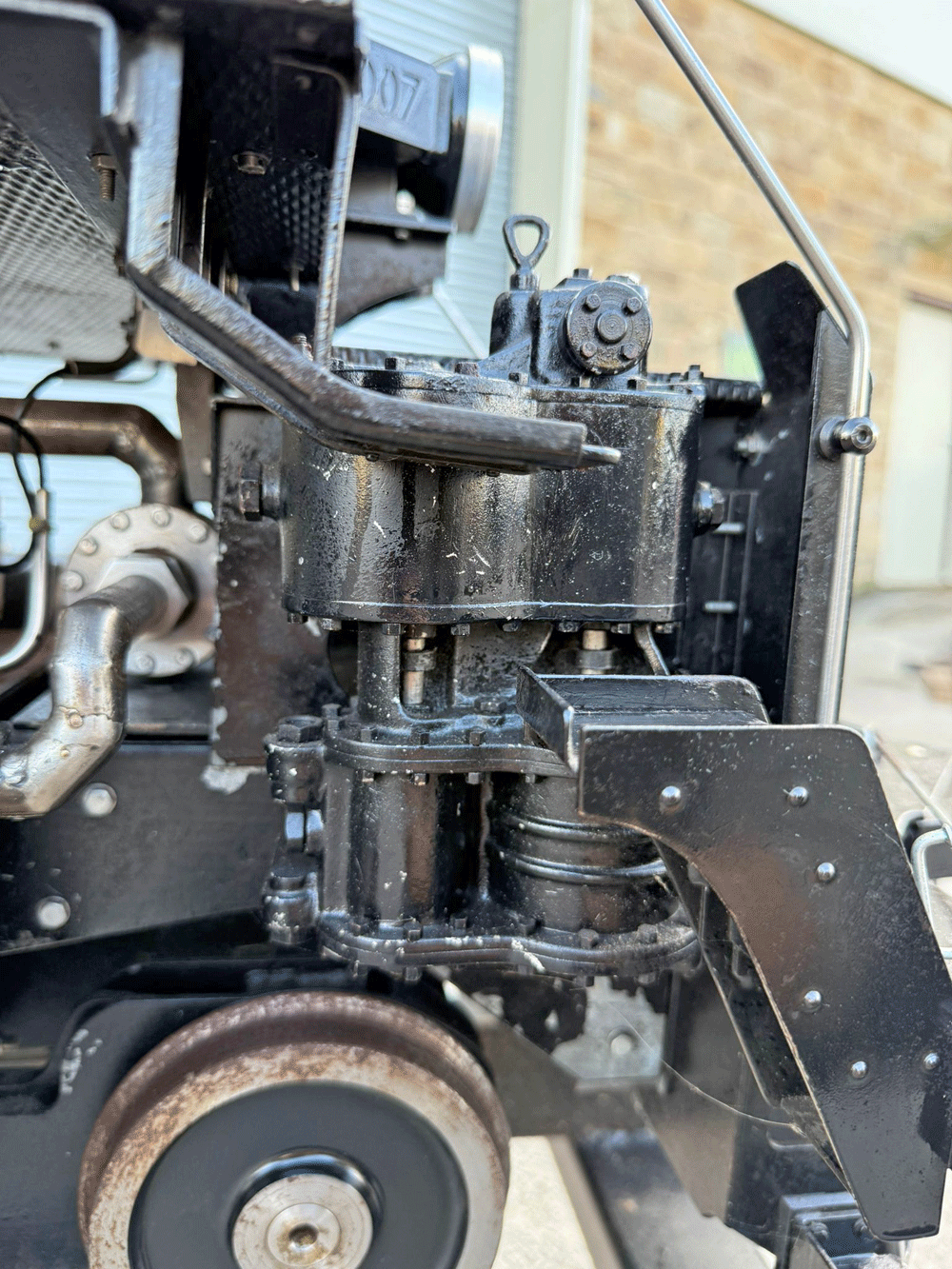 The correctly shaped boiler is steel with expanded in steel tubes, and is professionally (and nicely) made with all the important certification and paperwork. The bottom end is all there, and has run on air, and has also been tested around the track to make sure everything rolls, bends and follows the track as it should!
