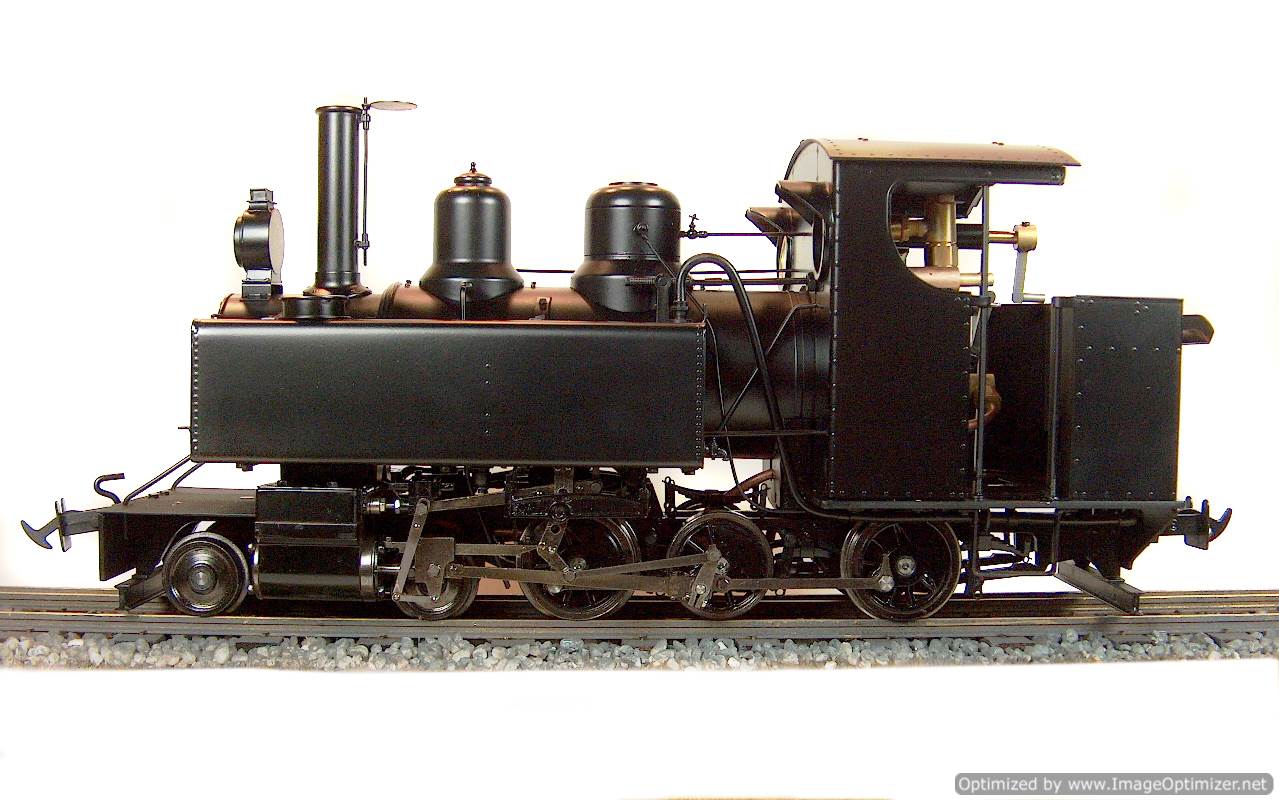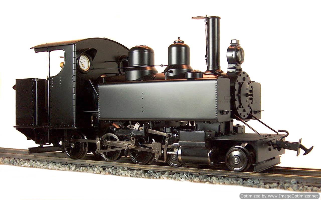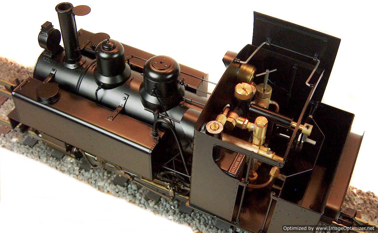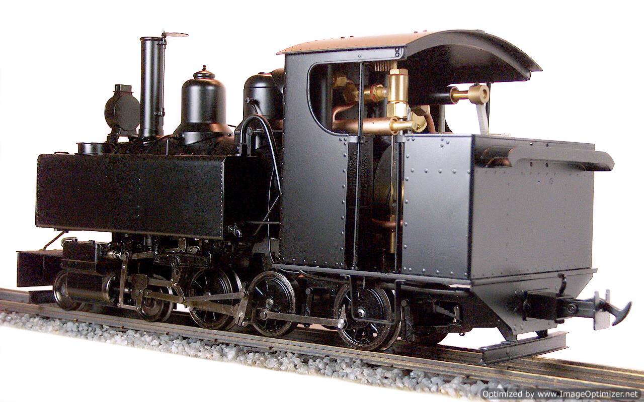 The model is internally gas fired and is constructed from etched brass and stainless steel. The model is only available in manual control version. The standard colour is satin black. Versions for 32mm and 45mm gauges are available. As the gas capacity is larger than the water capacity, a boiler top up system will be supplied. The boiler is fitted with a water gauge glass. The locomotive comes fitted with Accucraft's standard square headed chopper couplings. The wheels are insulated as standard. The cab roof lifts up and tilts sideways to give easy access to the cab interior.