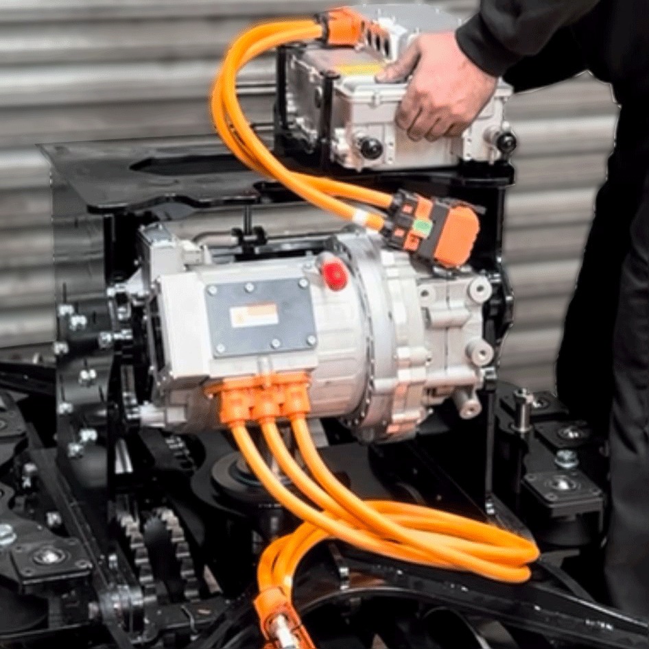 The drive and the regenerative braking for the Evolution Class locomotive is provided by 2 very compact 3 phase AC motors, one fitted into each bogie. Each motor has it’s own inverter, and both inverter and motor are water cooled. The whole system is managed by an extremely robust VCU (Vehicle Control Unit) which is also constantly communicating with the battery management system to dynamically adjust performance or regen when needed to protect the battery for longevity.
